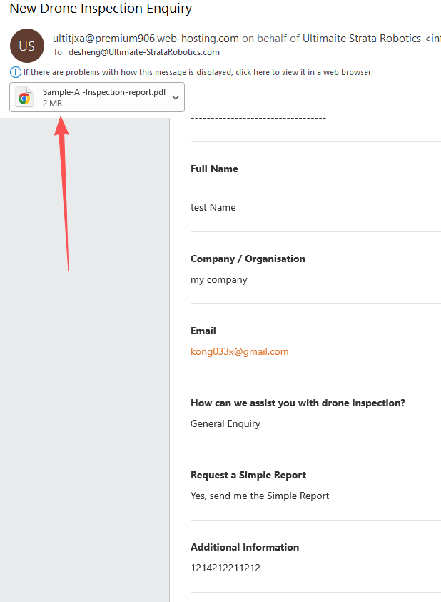 This improvement made the form flow more practical and business-oriented by connecting user input with a clearer follow-up outcome. The submitted enquiry could then trigger an email output that included the requested report as an attachment, making the process more complete and easier to understand.