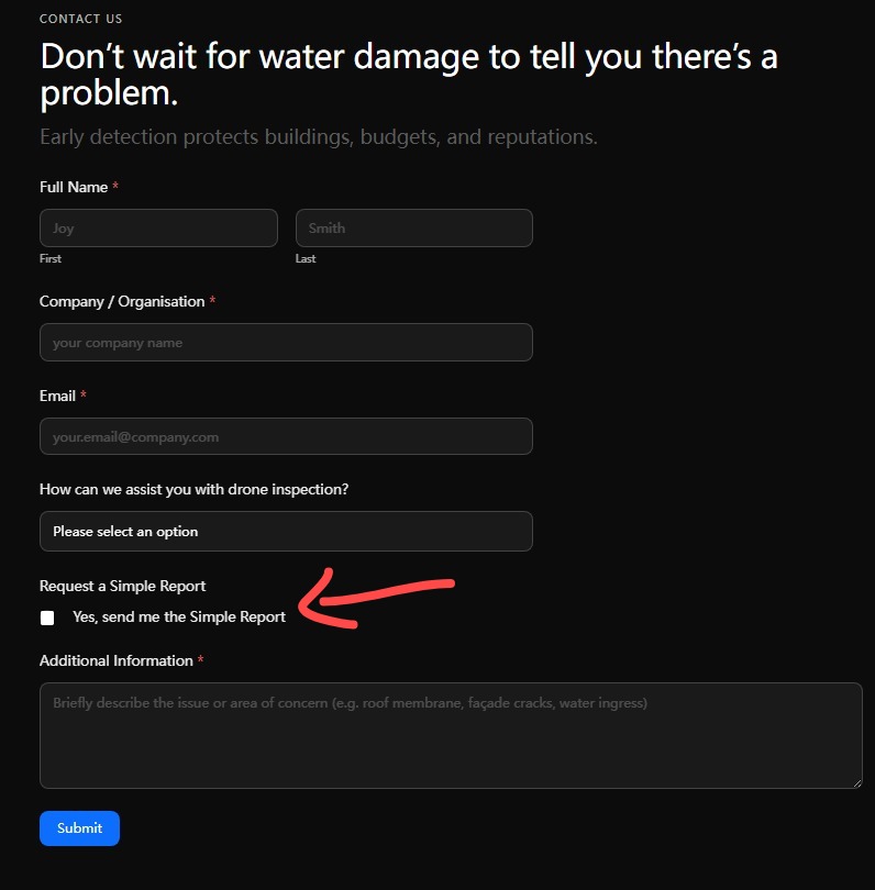 Based on the manager’s requirements, I updated the enquiry form to better reflect the intended workflow. This included restructuring input fields and introducing a simple report request option, allowing users to clearly communicate their needs while aligning the form with business objectives.